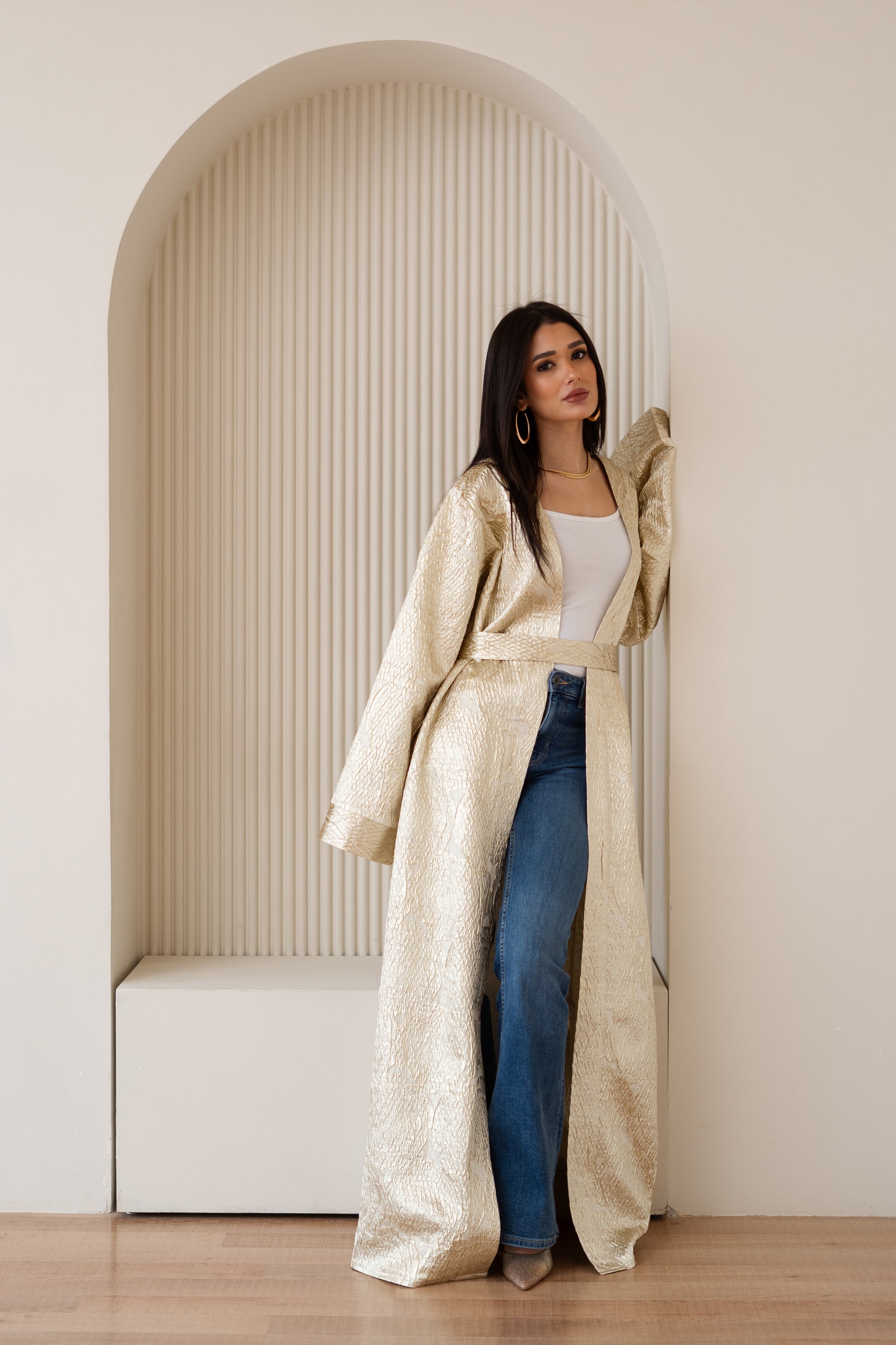 Draped in gold, the Glow Kaftan radiates effortless beauty and grace. Its rich texture catches the light with every movement, making it an ideal choice for special occasions, from Iftar nights to wedding celebrations. Style it with statement accessories for an unforgettable look.