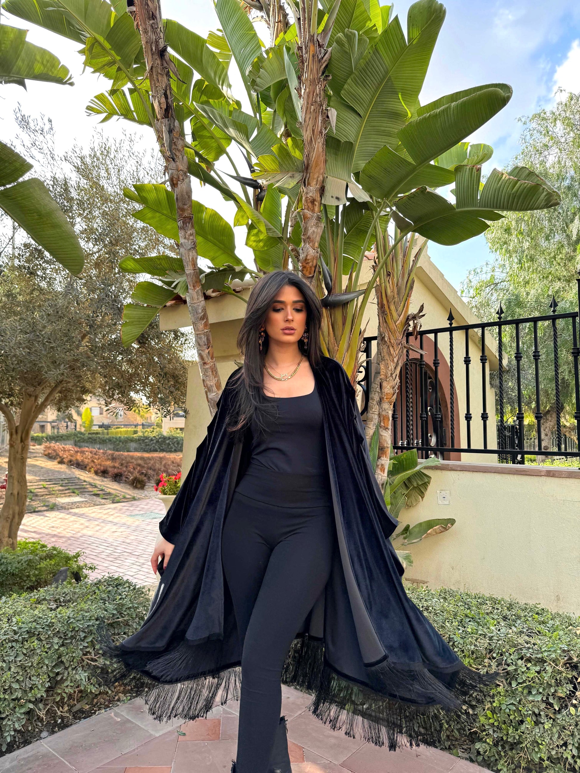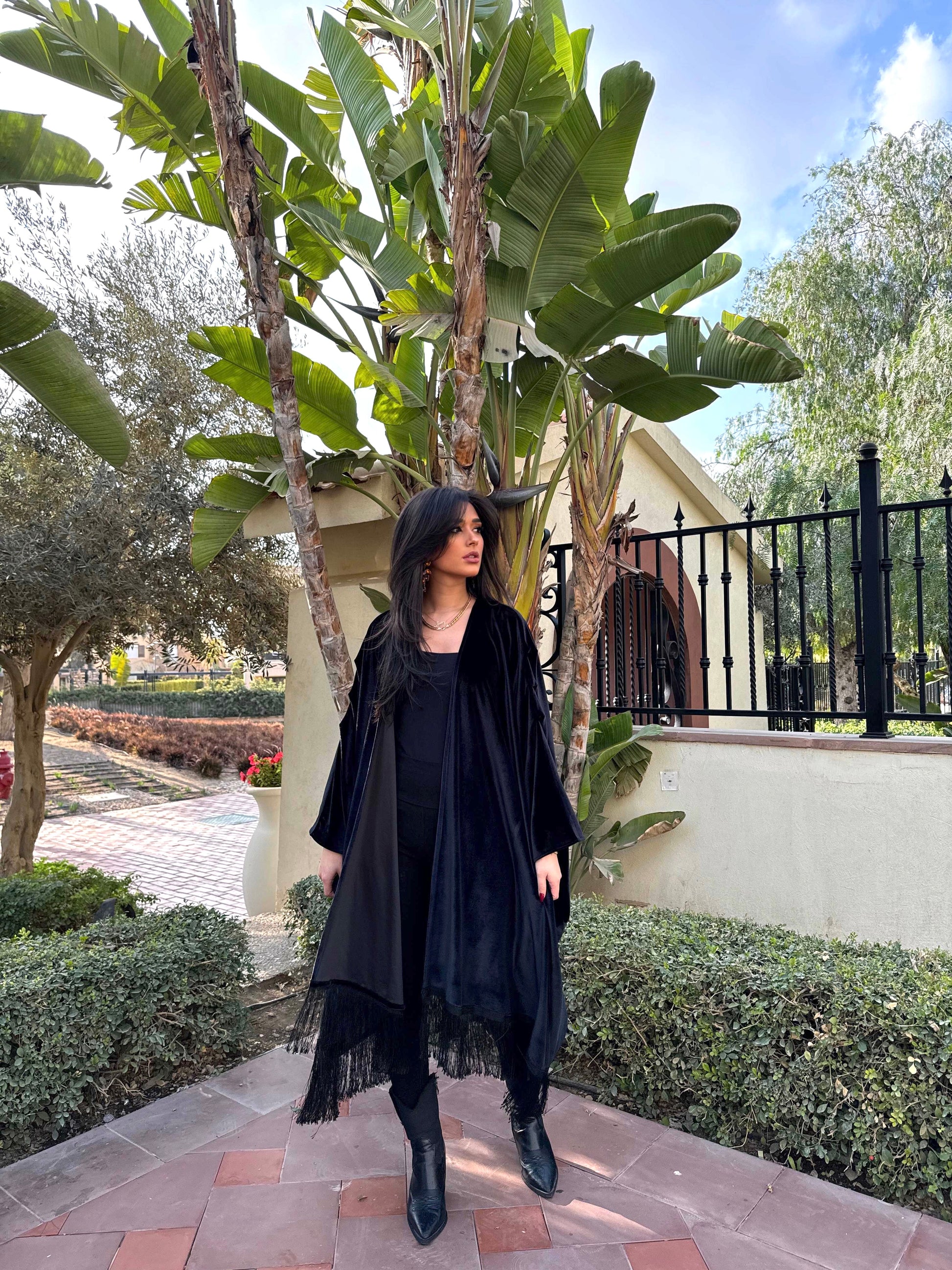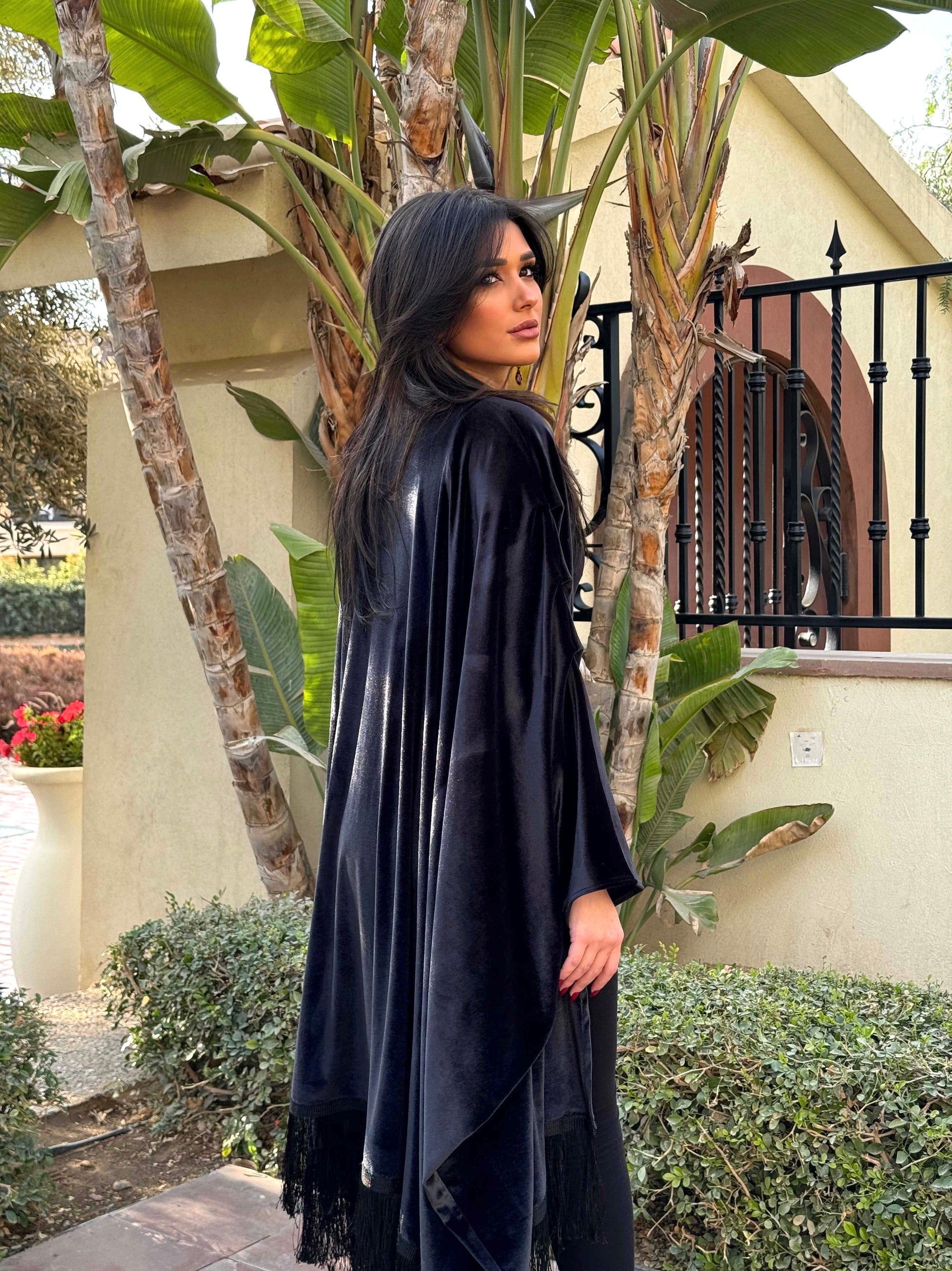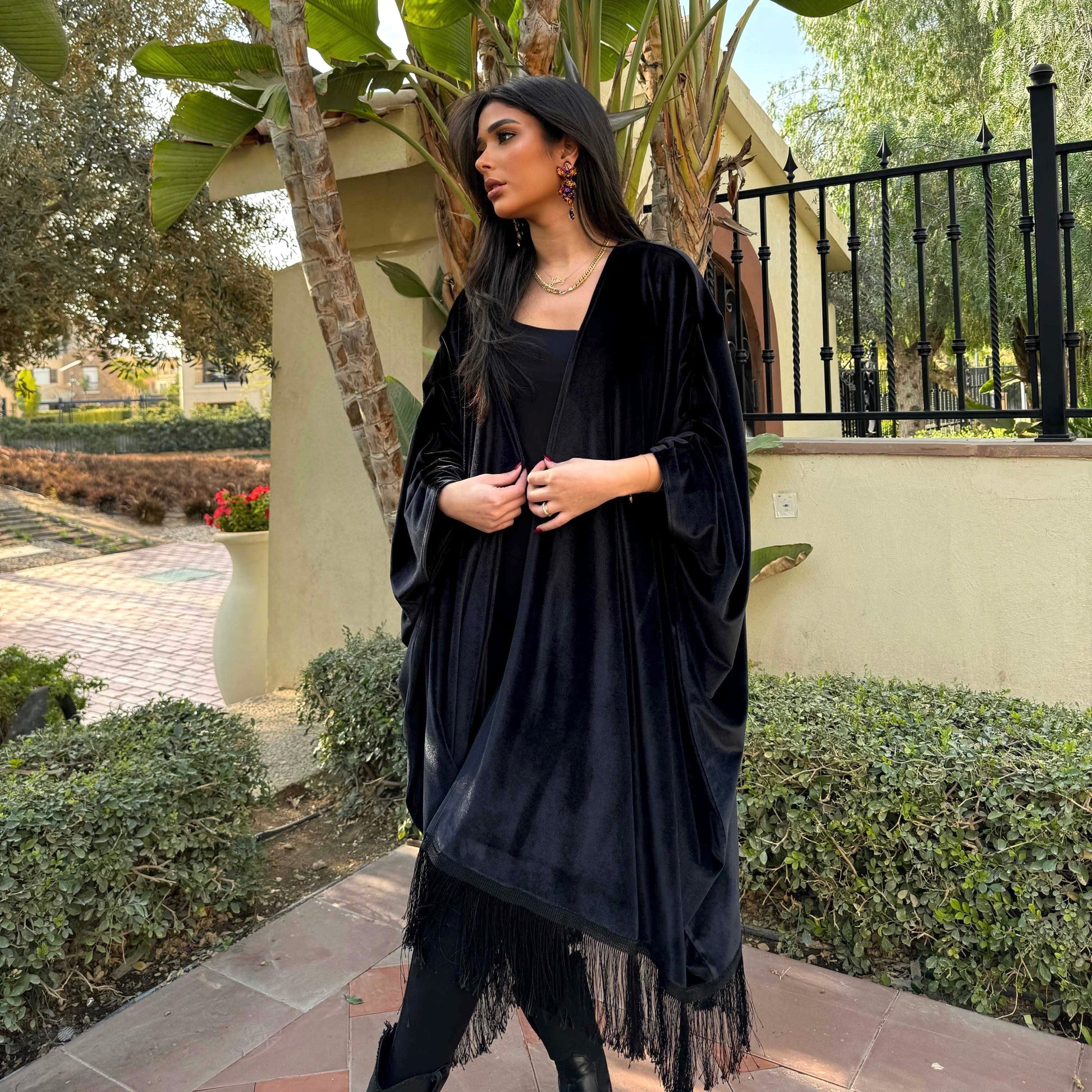 This Velvet Black Fringed Kimono adds an oriental touch to any outfit. Perfect for casual day outings on jeans or a fun addition to a dress at night. Shake things up in style with this Black Fringed Kimono!