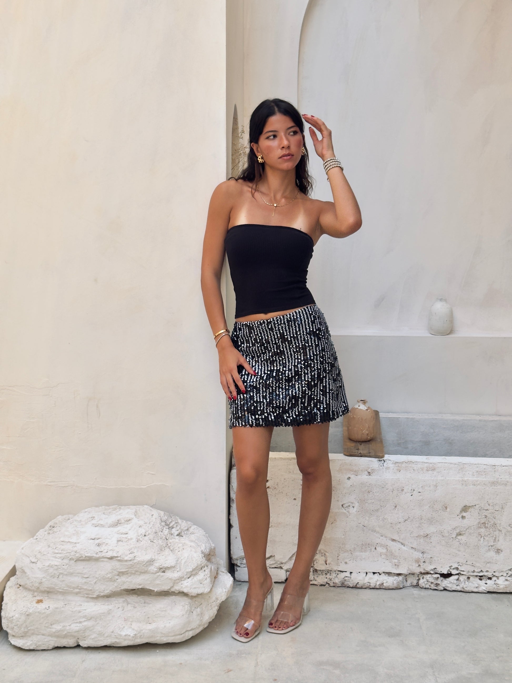 Add a sparkling touch to your wardrobe with the Blair Mini Skirt. This chic, skinny skirt dazzles in silver glitter, perfect for turning heads with a Parisian flair. Whether you're out for a night on the town or just feeling fabulous, this mini skirt brings playful elegance to any outfit.