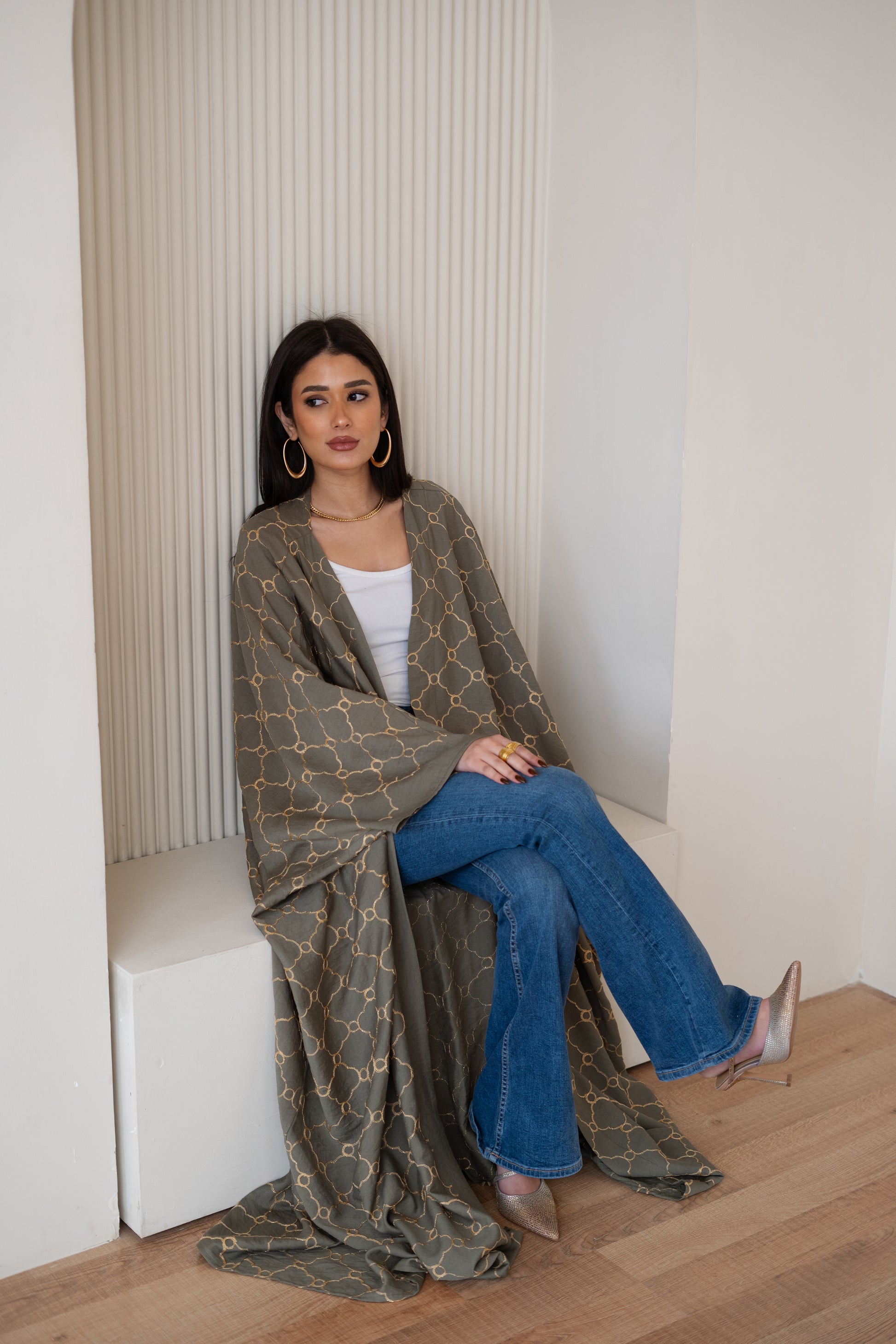 A perfect blend of earthy elegance and timeless sophistication. Designed in a rich sage hue with delicate gold embroidery, this flowing kaftan embodies effortless grace. Its lightweight fabric and relaxed silhouette make it an ideal choice for Ramadan gatherings, Eid celebrations, and refined everyday wear.
