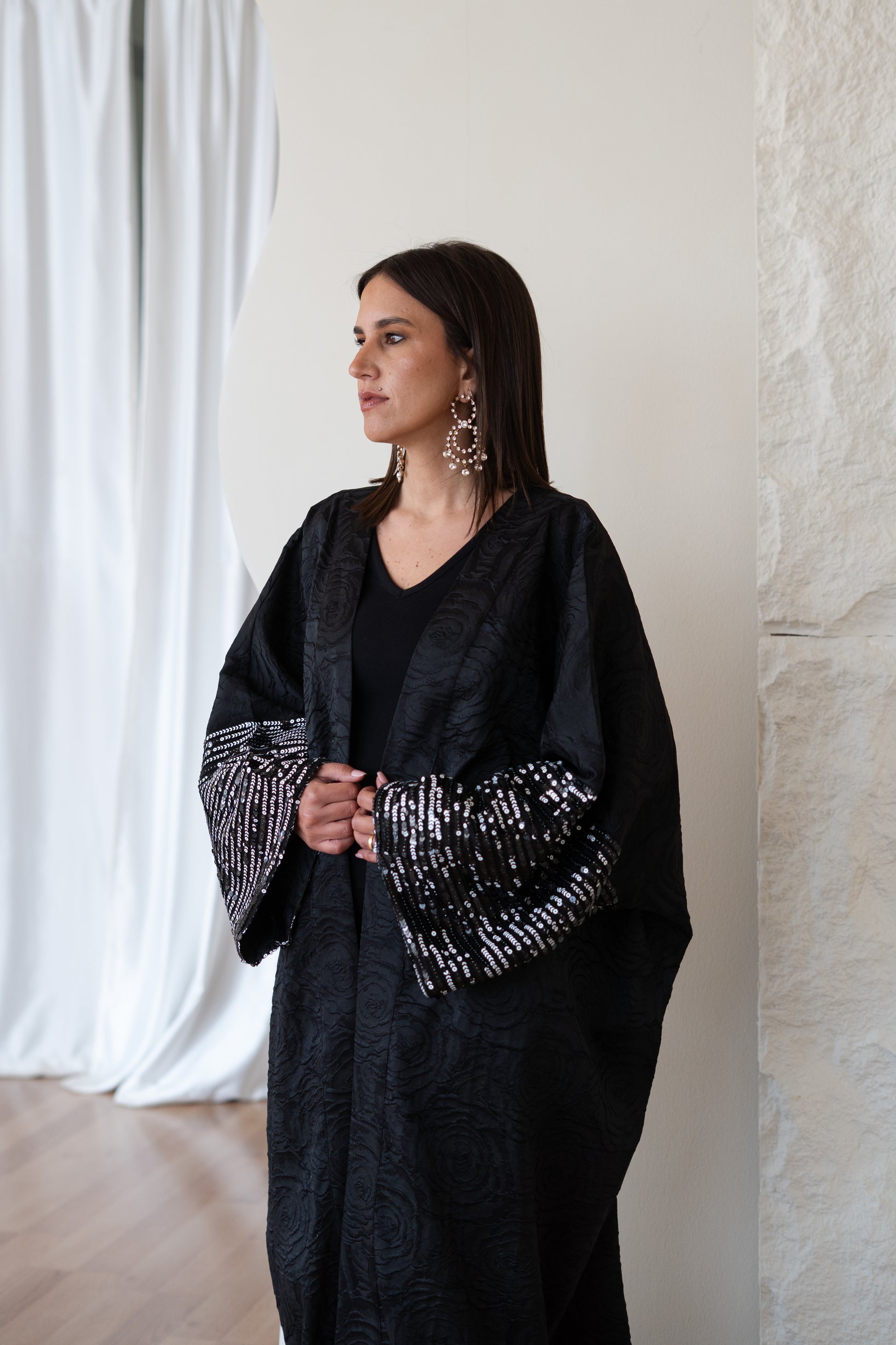 The Nous Kaftan embodies timeless elegance with a touch of embellishment. Crafted in classic black, its flowing silhouette is enhanced by delicate sleeve details, adding subtle glamour while maintaining a refined look. Perfect for Ramadan gatherings, evening events, and effortless chic styling, this kaftan is a must-have for those who appreciate understated luxury.