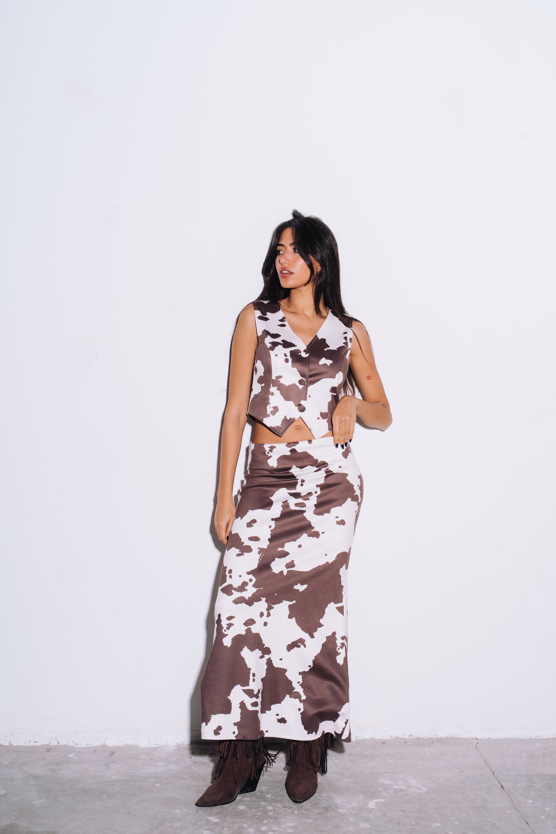 A bold two-piece set designed to stand out. Featuring a sleeveless fitted crop top paired with a high-waisted maxi skirt, both crafted in a striking brown and off-white abstract print. The silhouette hugs the body beautifully while allowing comfortable movement.