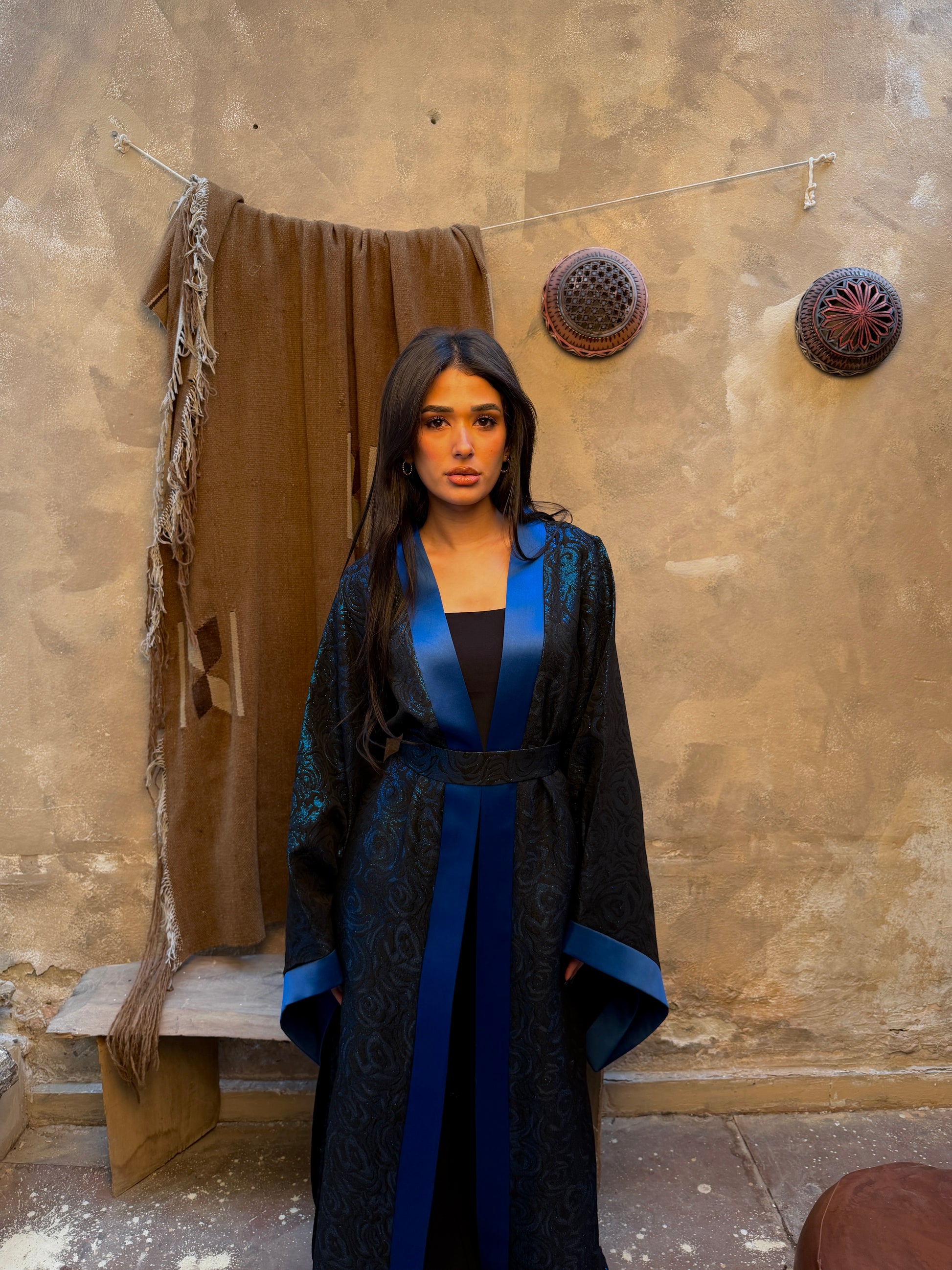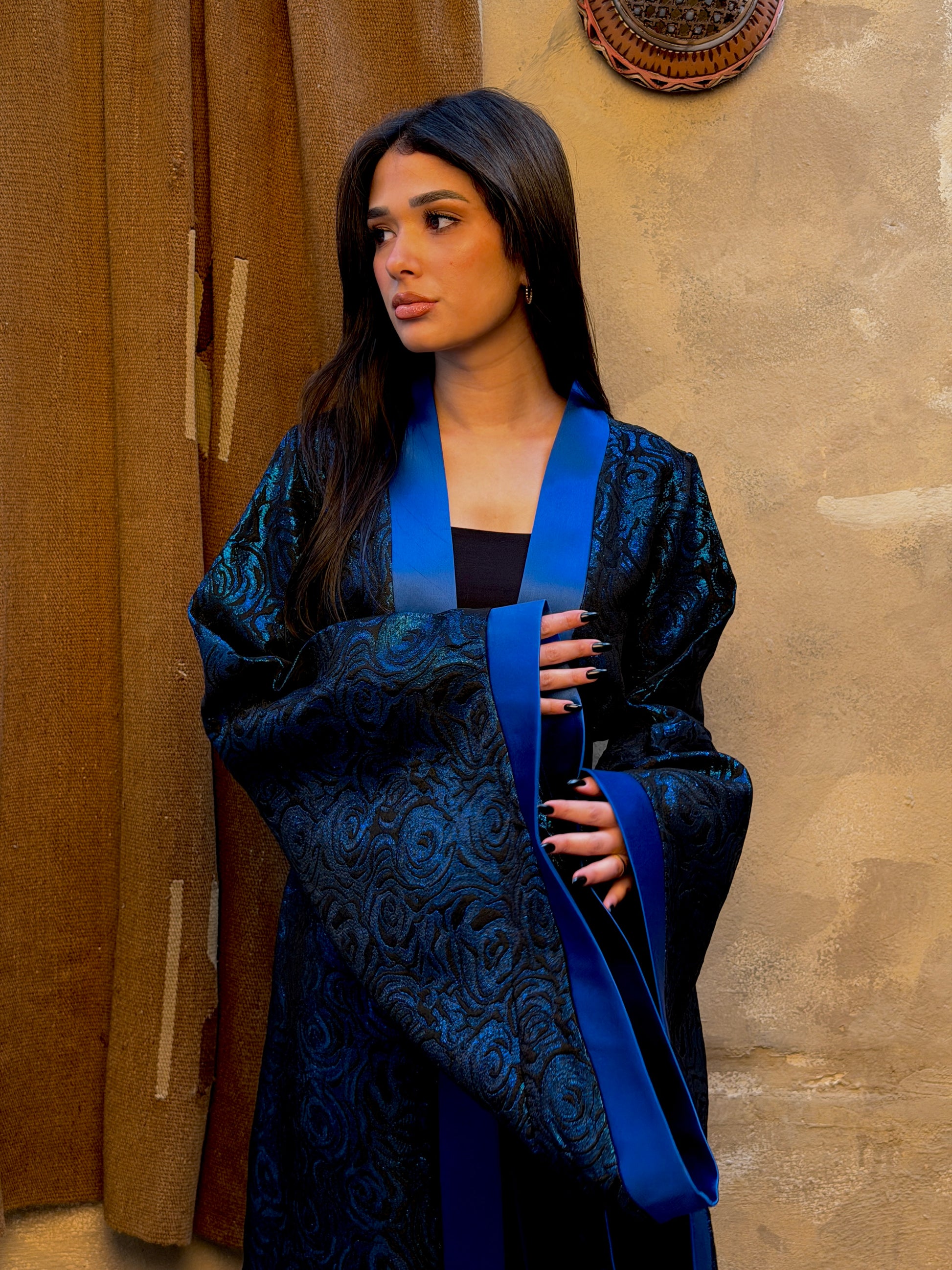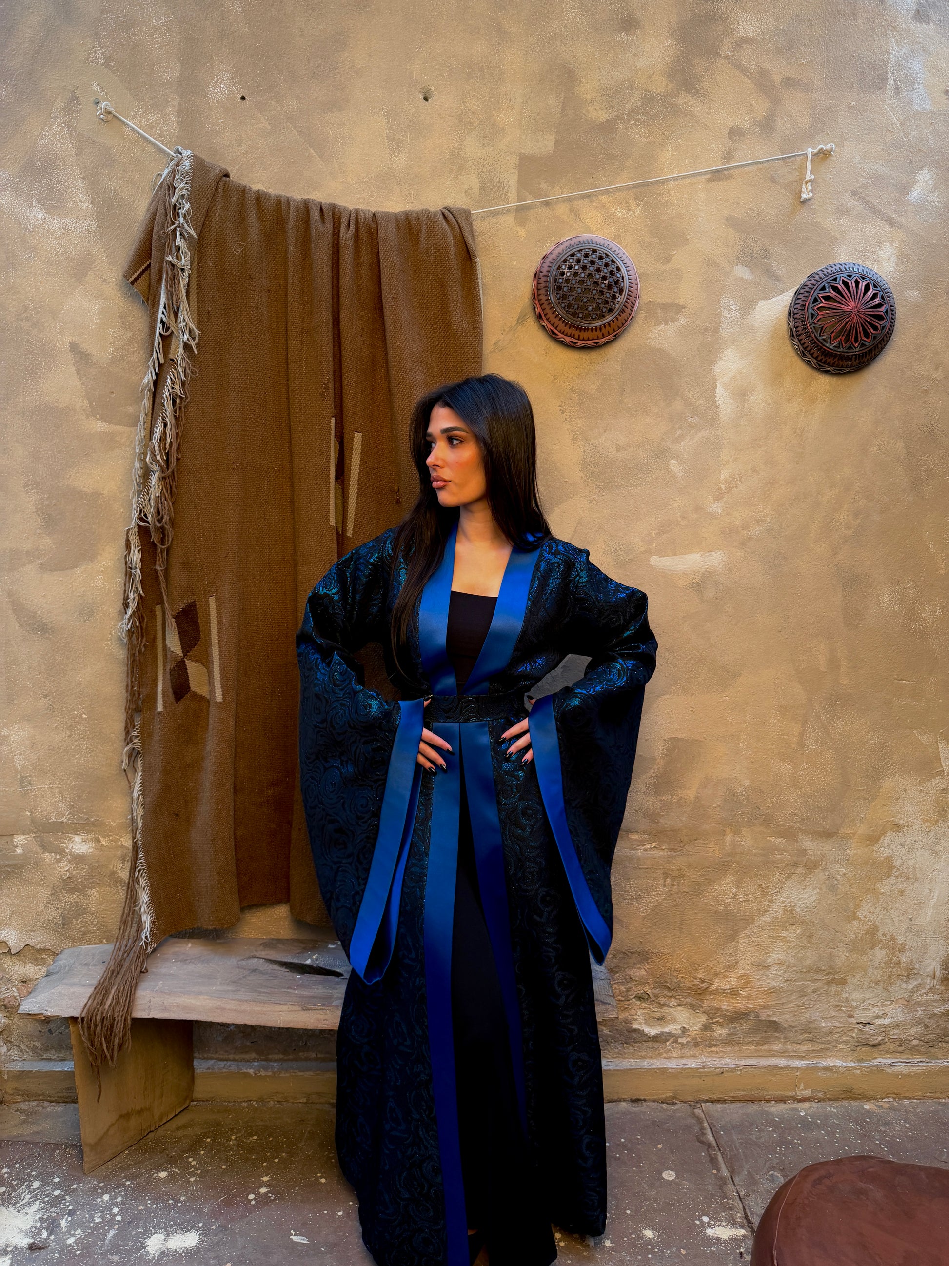 Defined by its bold, structured satin panels in a vibrant royal blue. These panels frame the open front and line the wide, dramatic sleeves, creating a sharp, architectural silhouette with satin-waist tie allowing the wearer to transition from a flowing, ethereal look to a more tailored, cinched shape.