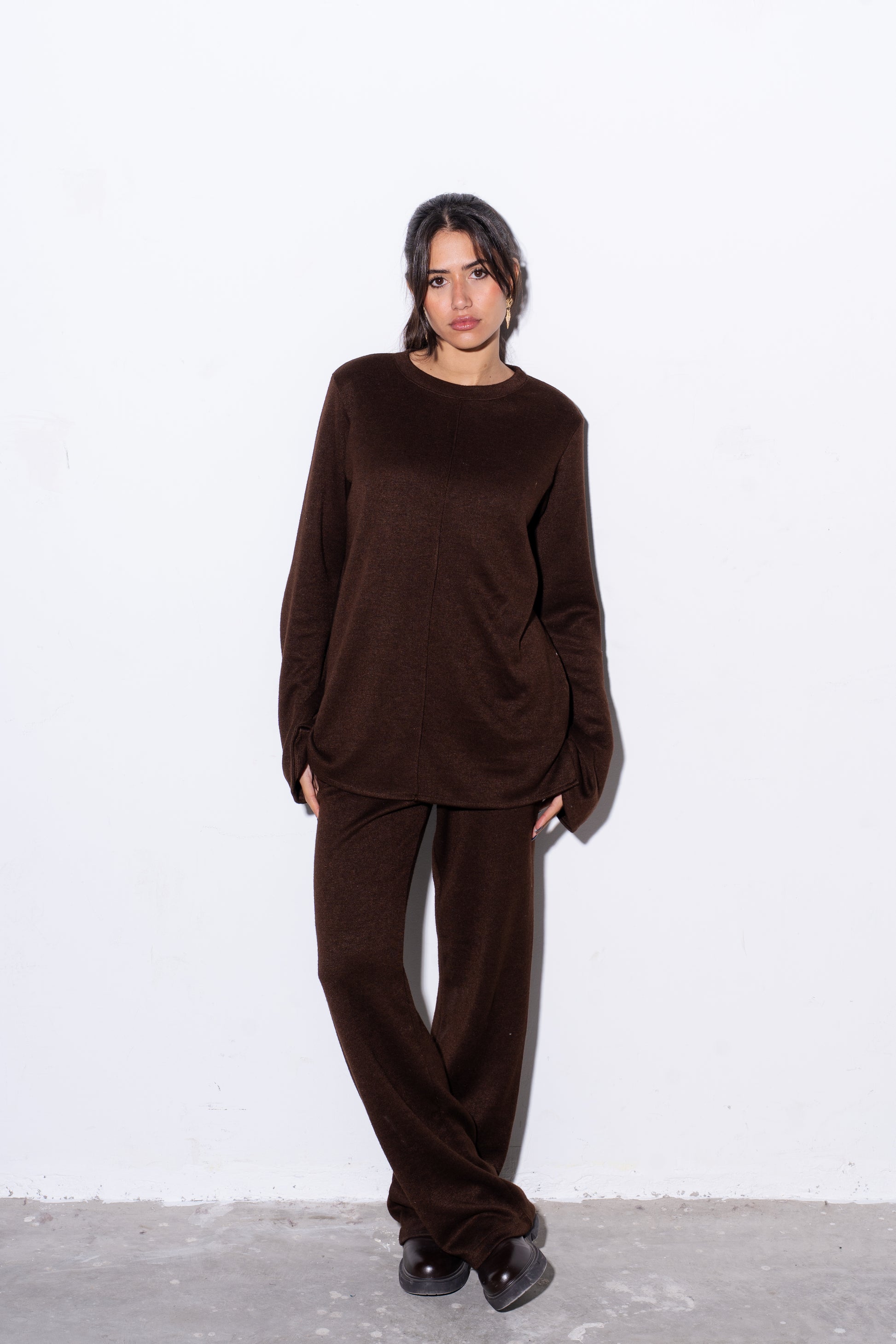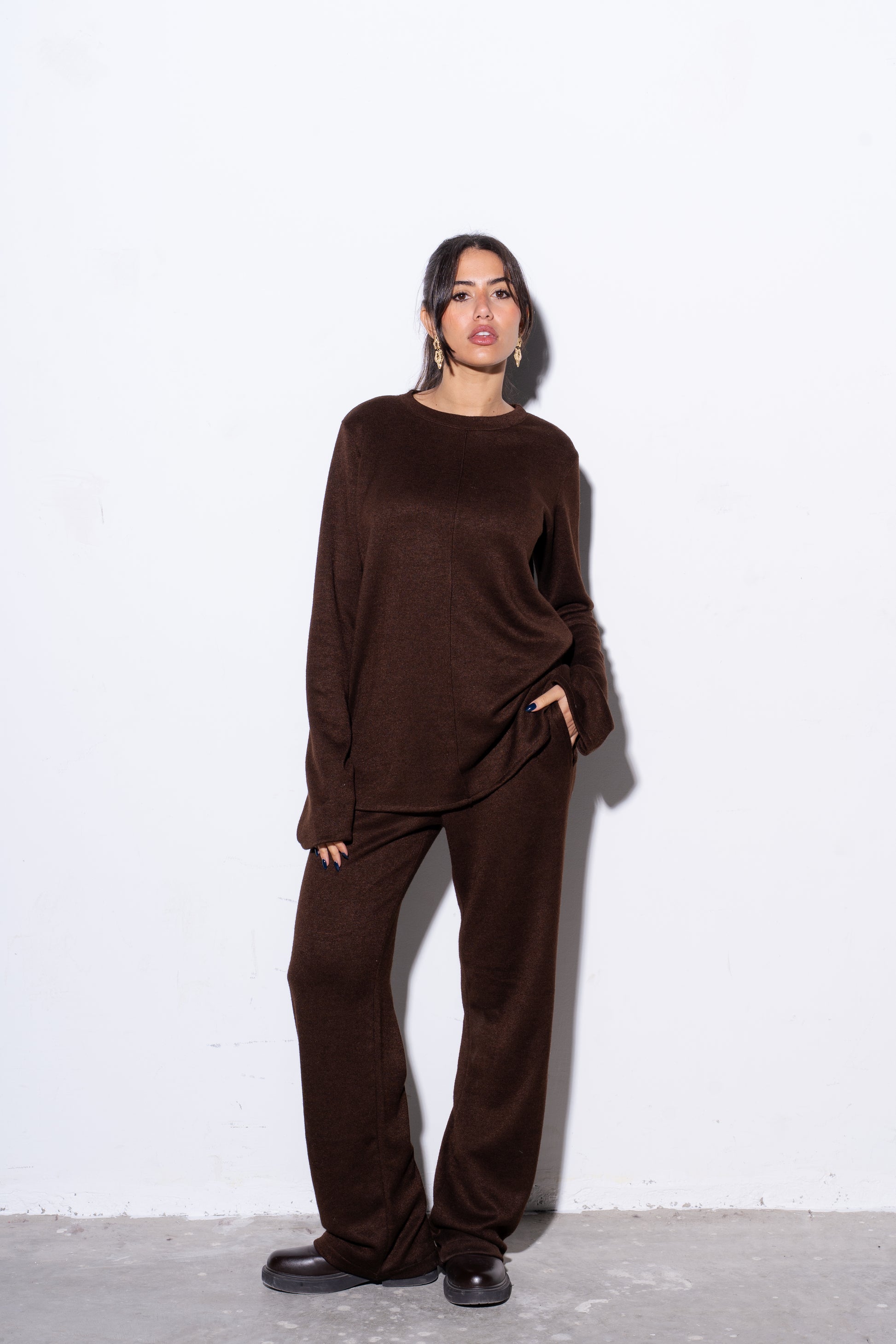 This two-piece set is crafted with a relaxed silhouette that drapes effortlessly over the body, balancing comfort with quiet sophistication. The fluid top features a clean neckline and soft structure, while the wide-leg trousers fall with natural movement, creating a polished yet undone look.