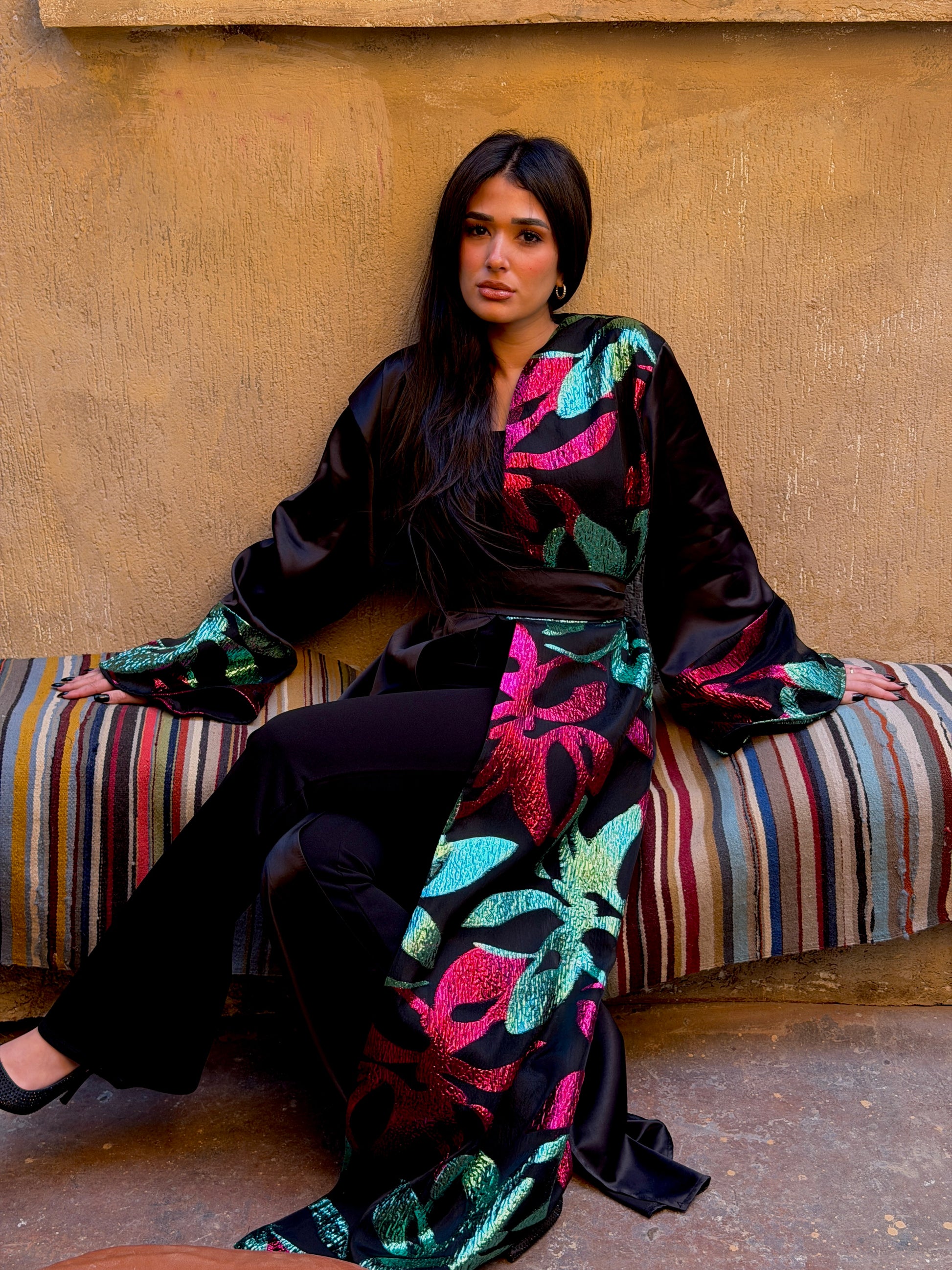 This kaftan is crafted from a high-shine black satin fabric that provides a luxurious drape, featuring a bold wrap-style front and expansive flared sleeves. The garment is defined by its dramatic, oversized botanical leaf motifs that sweep across the silhouette in a vibrant display of metallic colors. Designed to blend traditional modesty with modern high-fashion flair, this statement piece utilizes its light-reflecting textures and asymmetrical patterns to create a captivating visual impact for any formal evening occasion.