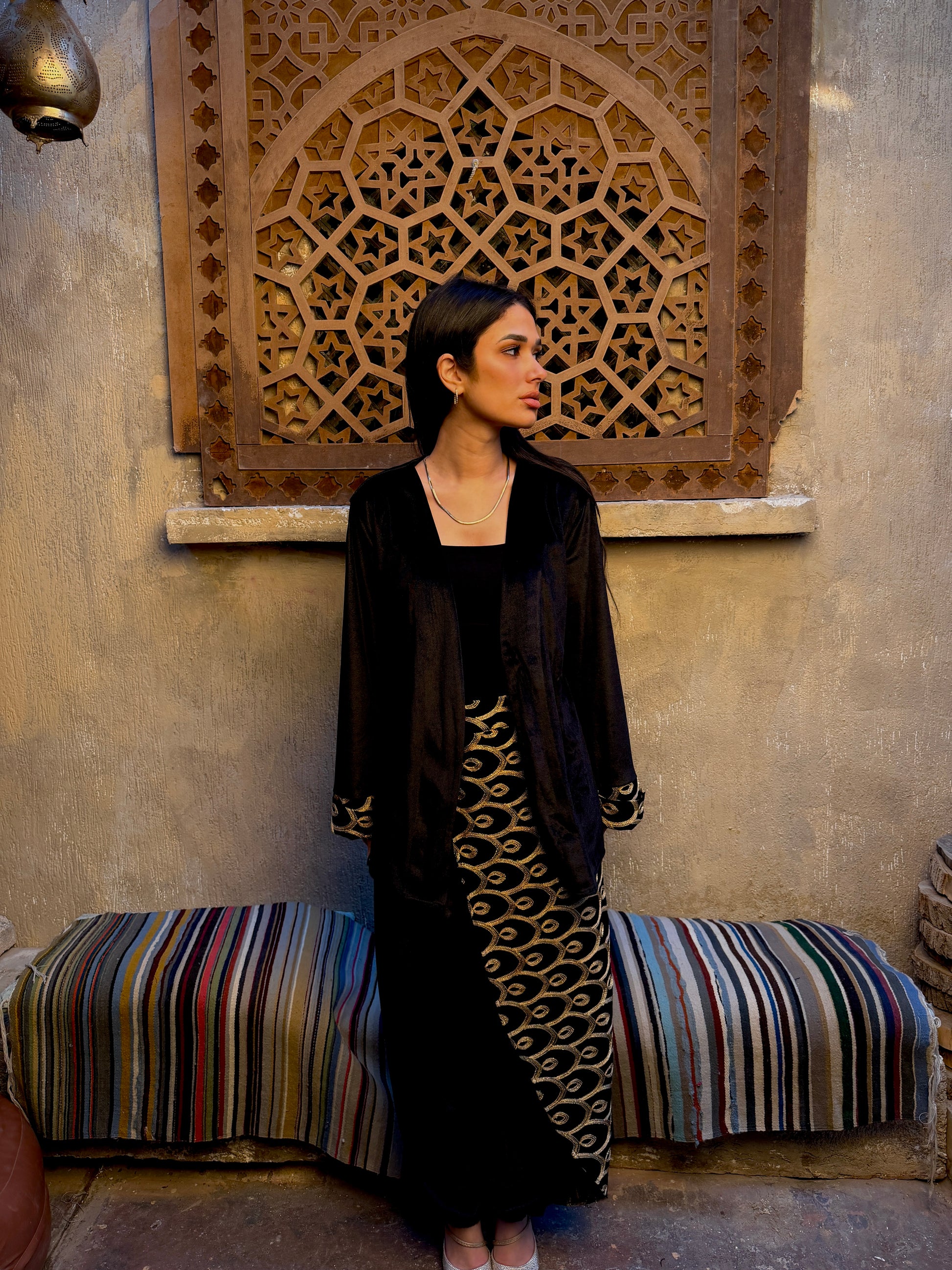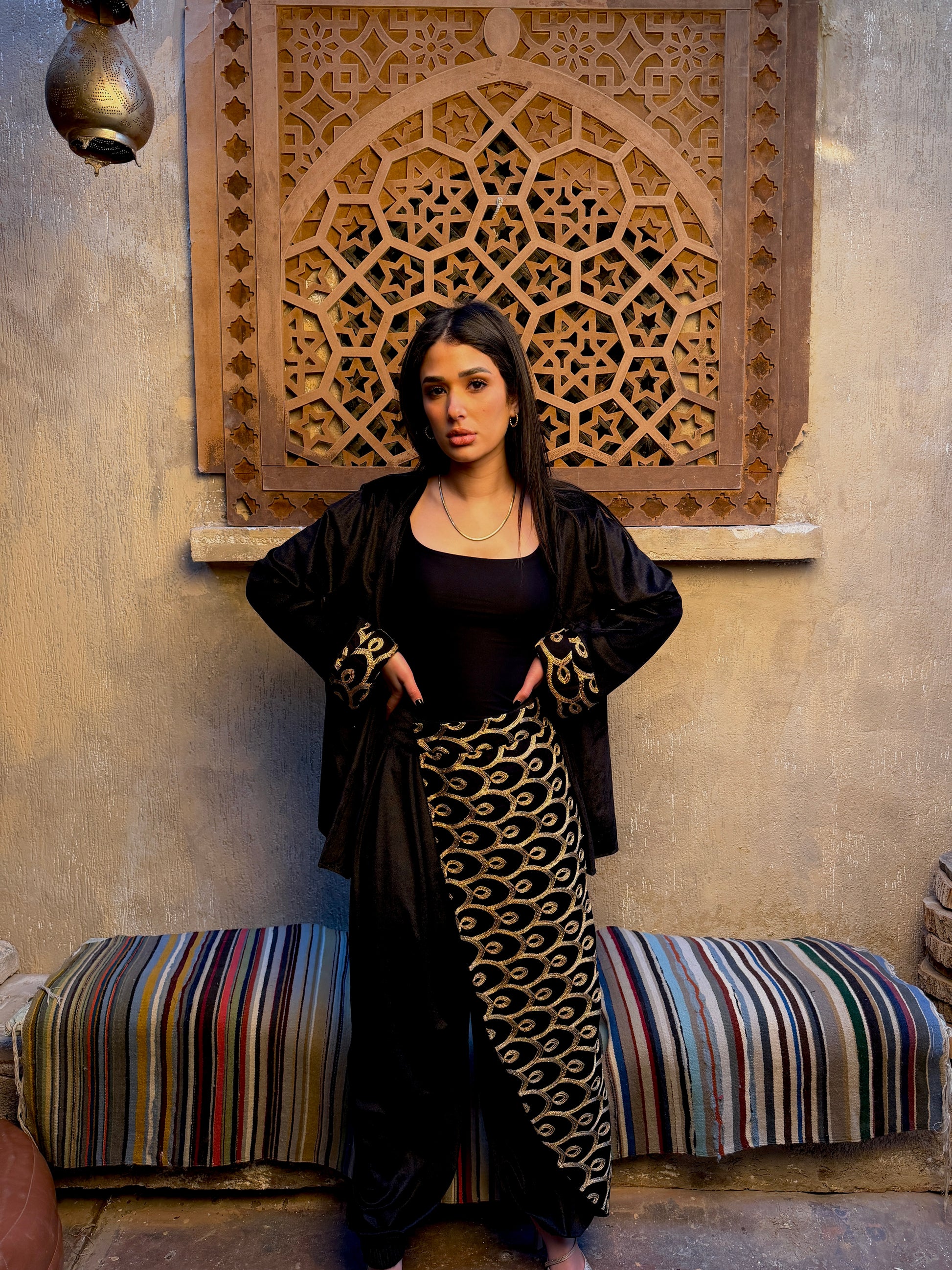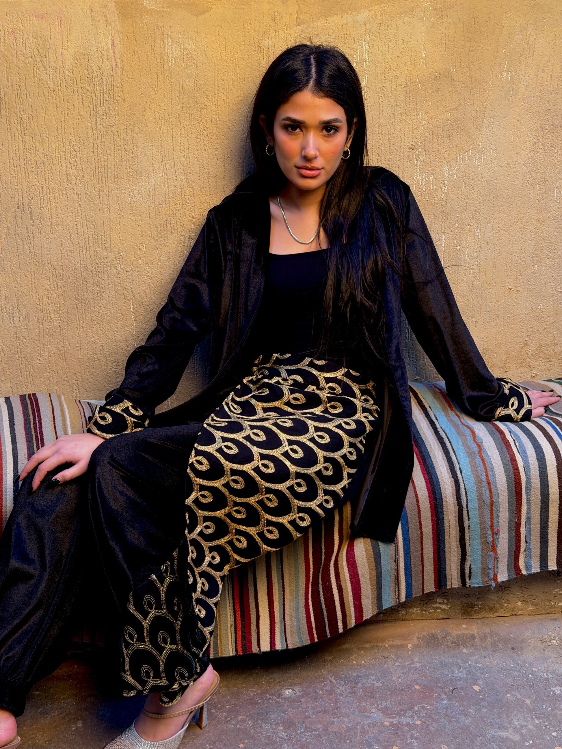 Exuding modern cultural elegance, this set combines a soft black velvet layering piece with sleek jersey-knit trousers that feature a bold, wrap-around gold brocade panel for a high-contrast festive look.