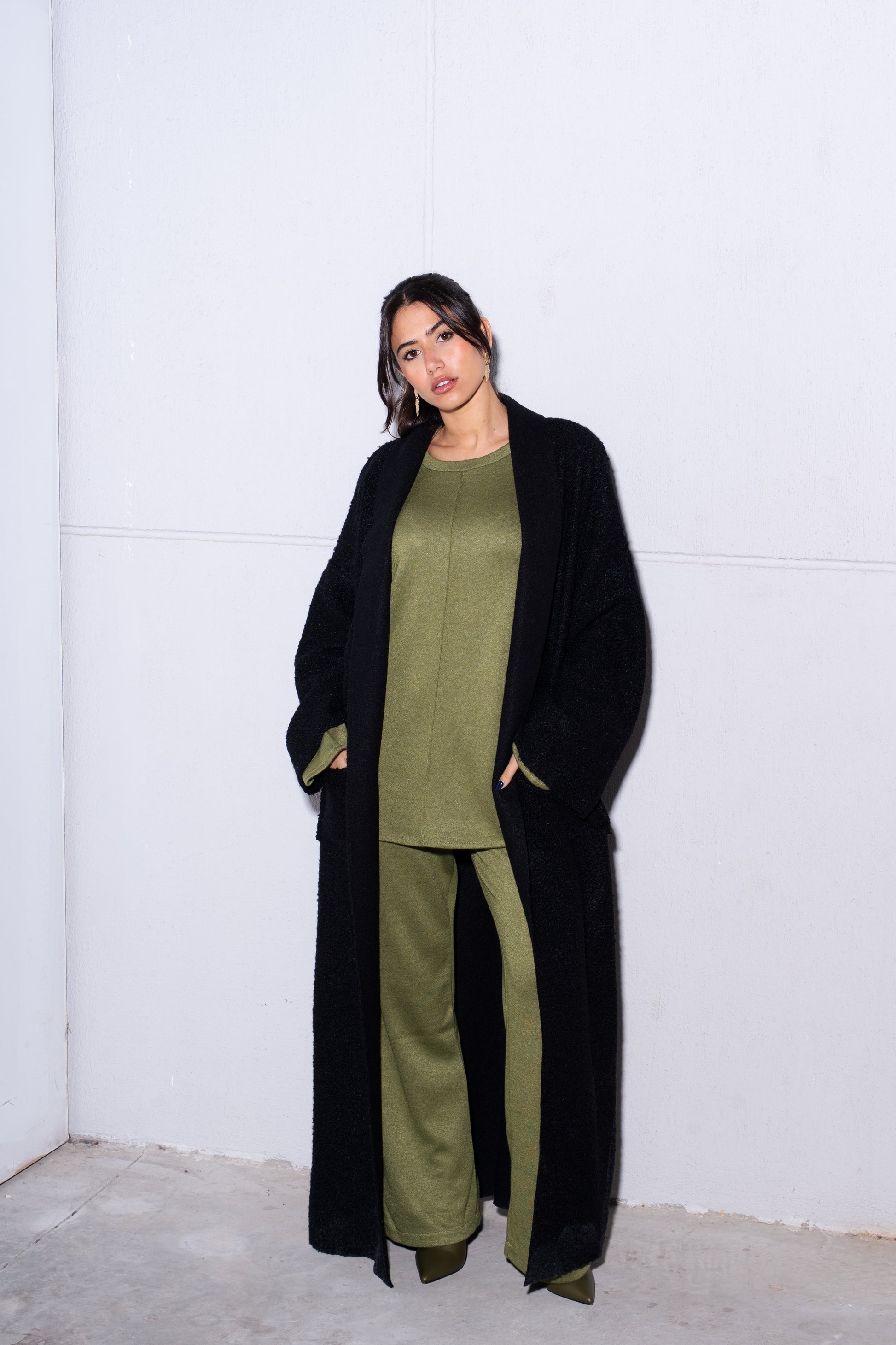 This coat exudes effortless elegance, featuring a long, open-front design that drapes beautifully. Crafted from a soft, textured fabric in a warm ivory hue, it offers a cozy yet sophisticated touch , includes practical side pockets, adding functionality to its chic appearance.